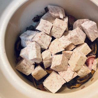 Taro: Peel and cube the taro. Lightly fry the cubes in a pan until they start to color, then set aside.
