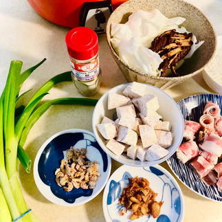 Prep: Soak dried shrimps in 1tsp rice wine, and shiitake mushrooms in warm water until soft. Squid out water, then cut into shreds. Marinate pork slices with pepper and a touch of soy sauce.